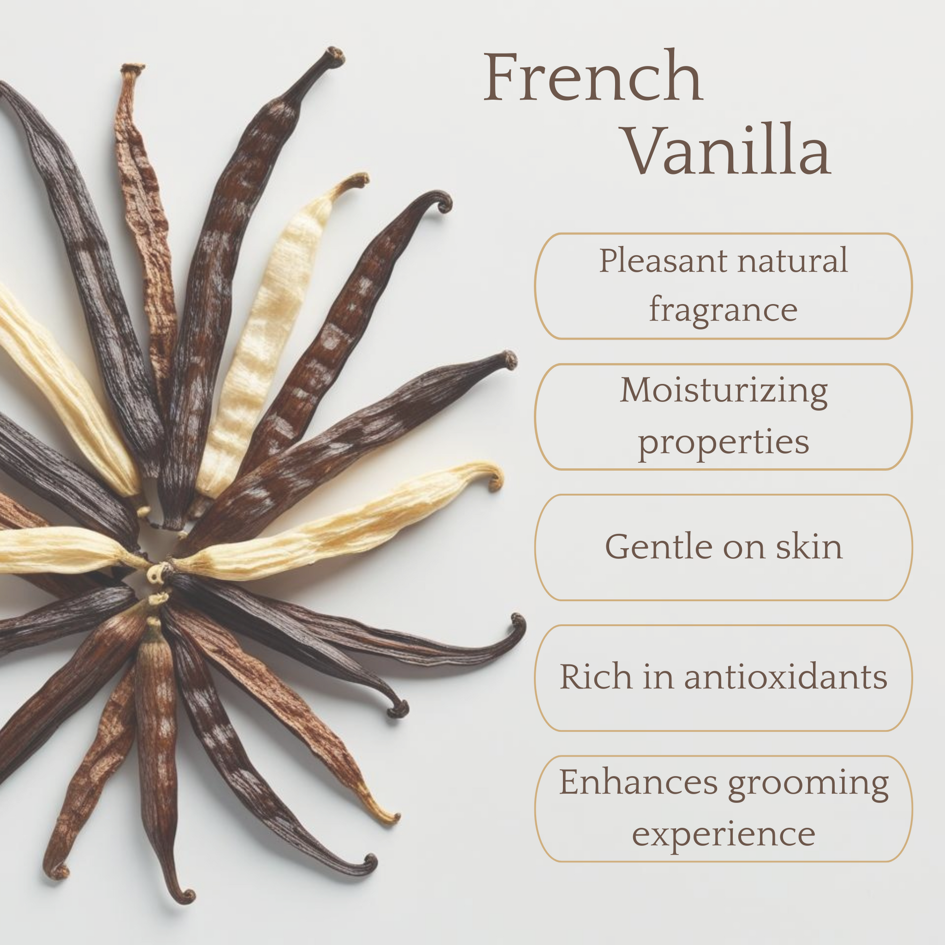 Transform bath time into a spa ritual with our French Vanilla Nourishing Shampoo. Made with french Vanilla, rose water, aloe vera, and botanical cleansers, it cleans deeply without stripping natural oils—leaving fur silky, hydrated, and lightly scented with comforting vanilla.